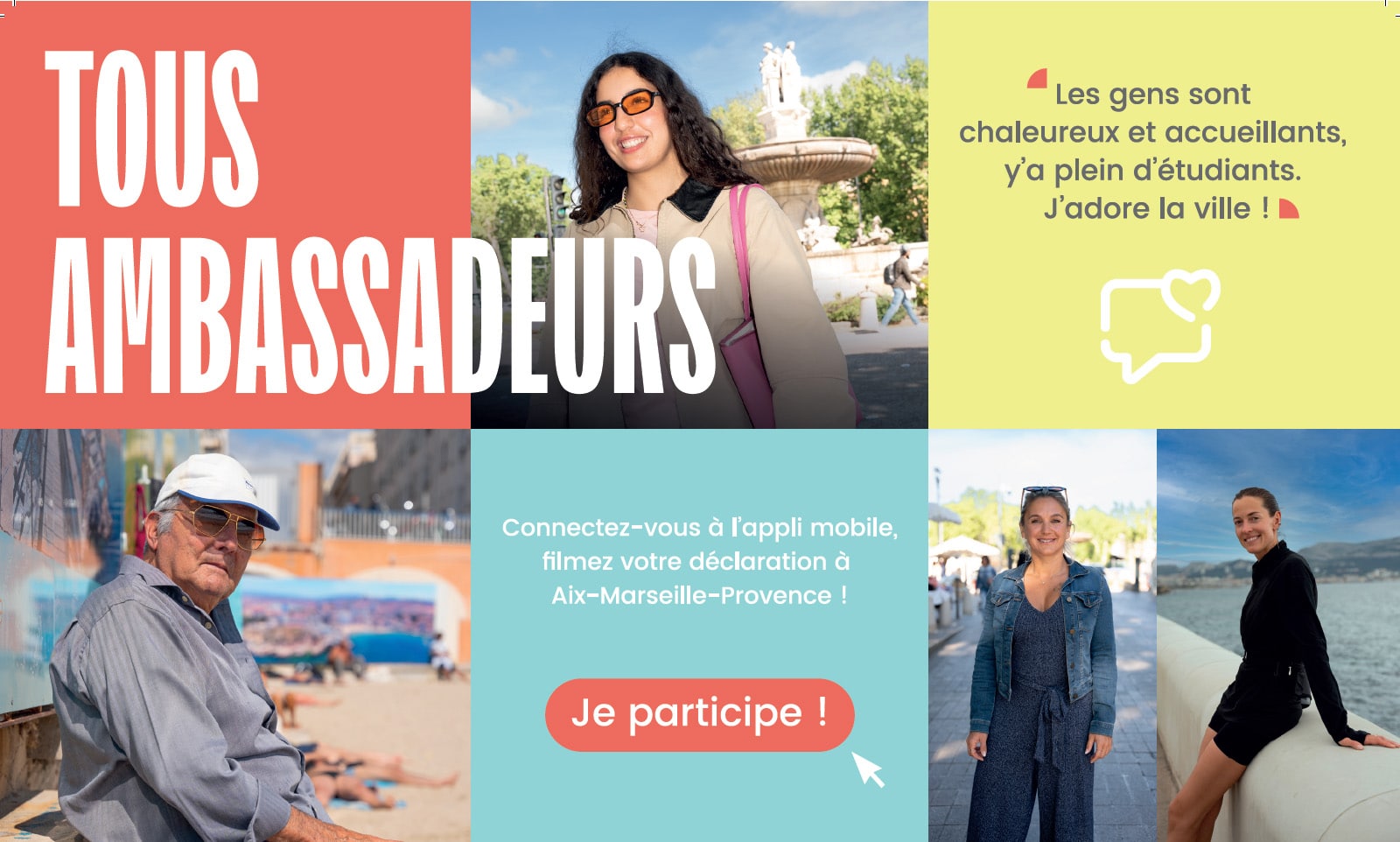 Construite autour des portraits sur le vif et de citations de “vrais habitants” d’horizons variés (merci à eux!), cette campagne révèle le dispositif Tous Ambassadeurs. Elle invite à regarder les premières vidéos en ligne et à venir témoigner à son tour via son mobile.